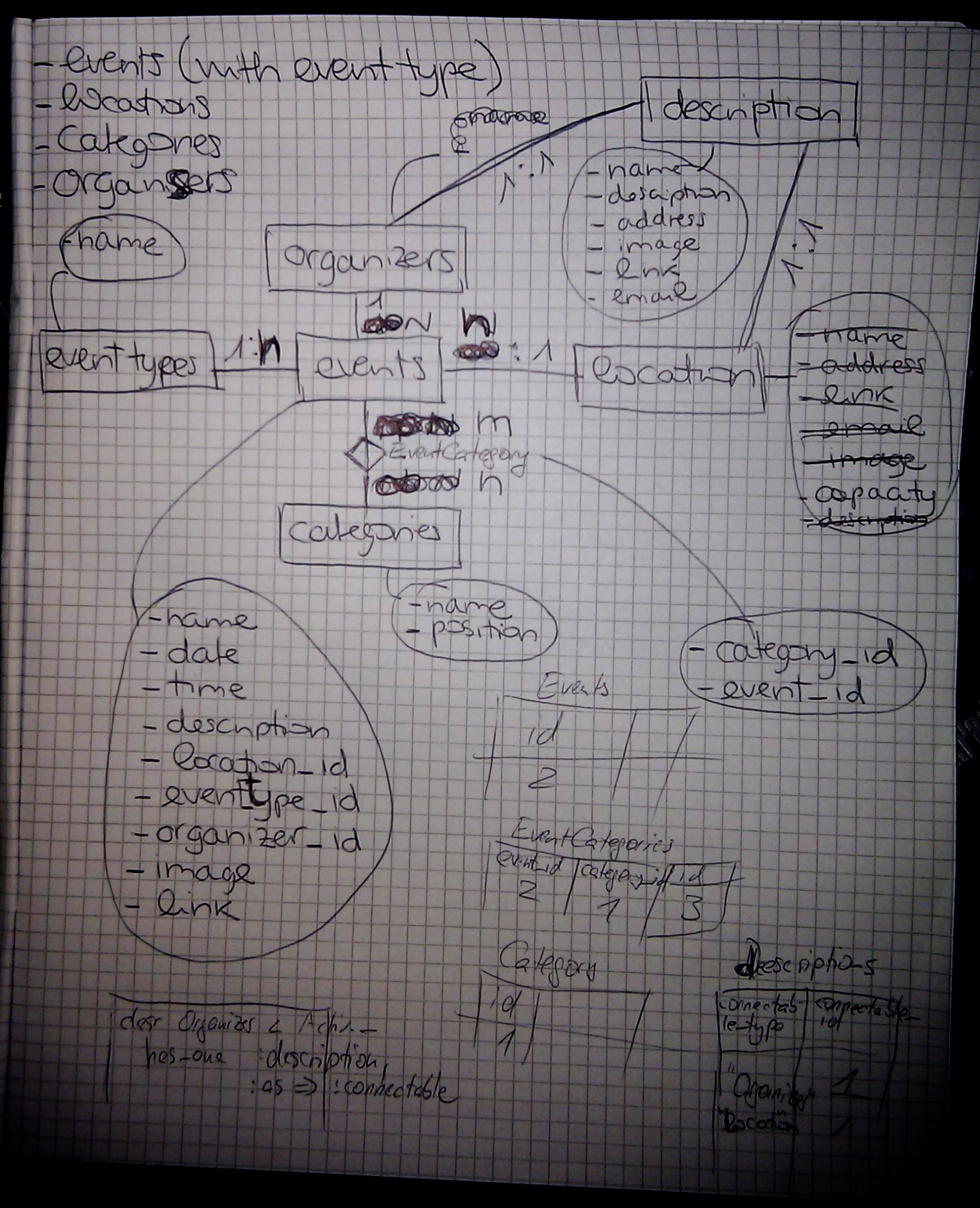 The next thing was to think about the data model, what did we need, what were the relations between the classes, first we had this diagram drawn by hand 🙂 ….