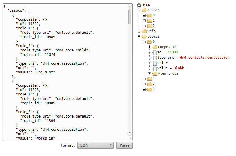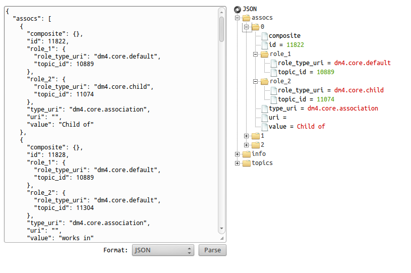 Take a moment, to check in the jsonparser, that the elements that form an association are id, role1, role2, type_uri, uri, value and composite. Inside role1 and role2 is stored the reference to the topicId to the "two sides" of the association.