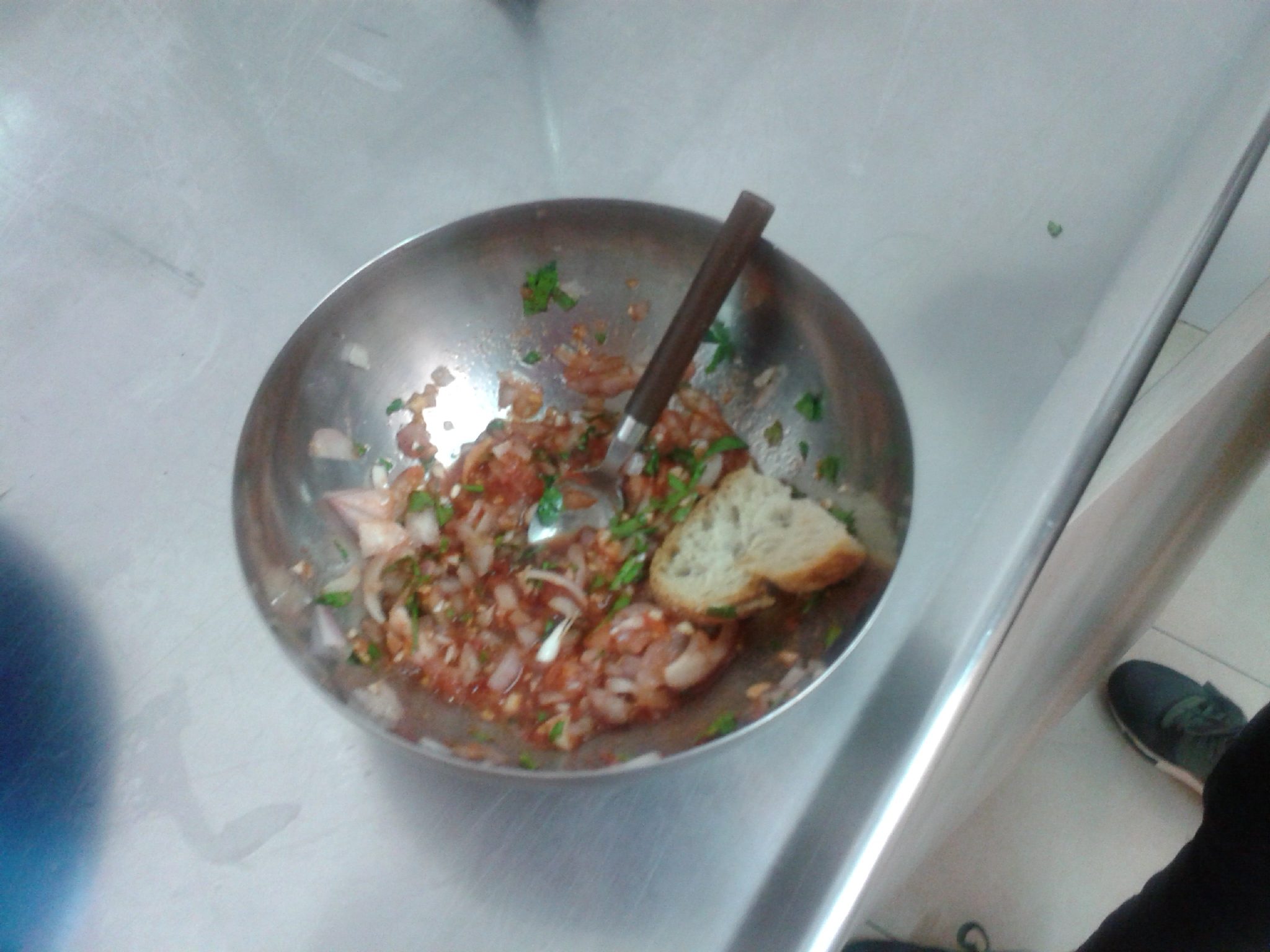 Cortamos cebolla (en este caso roja), ajo y perejil, por otro lado rallamos tomate, y cortamos una rodaja de pan (duro a ser posible), batimos todo en la batidora.