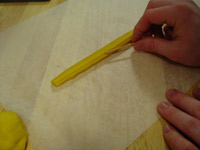 The dough was made, as per the dough used for the Ubuntu cookies. A small part was set aside and colored with a bit of yellow. About two to three times that that was set aside and colored with a bit of black color left over from the Tux cake. The last bit of dough (about twice as much as the black) was left plain.
