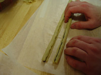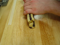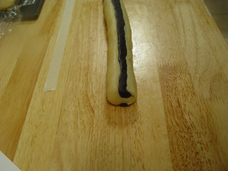 Onto the eyes. I rolled out two very small logs of black. These were chilled for a few minutes while I rolled out two very flat strips of plain dough. I removed the black logs from the freezer and rolled the flat strips around them, trying to keep one end open to attach to the beak. I didn’t know it at the time, but this would largely result in failure.