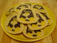 With all of the black in place and thoroughly chilled, I rolled the whole thing in the remaining plain cookie dough. I had been hoping to get a more circular pattern, but at this point, I was running out of dough and patience. Looking at the end of my log, I saw what looked kind of, sort of like Tux… if you squint a little, and maybe turn the lights down low.